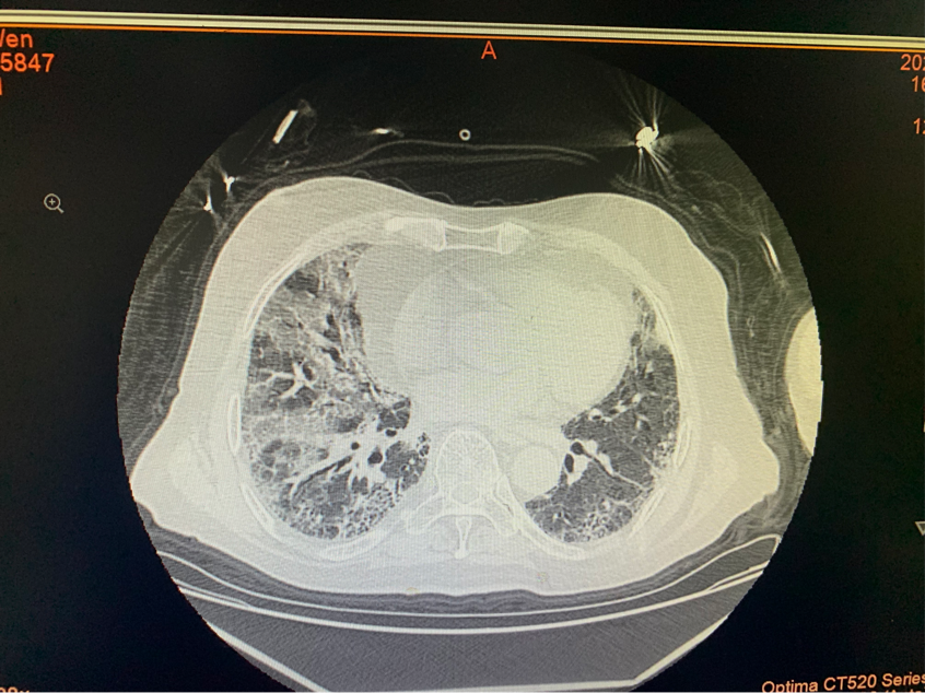 1月1日夜间10点,刚从科室回到家的江敏接到一位风湿病患者家属的电话,电话中焦急地说老父亲胸闷气憋的不行了,在来我院的路上。江敏知道这是位类风湿关节炎合并重症间质性肺炎的患者,一但合并病毒性肺炎,其病情将是雪上加霜,非常危重,所以她立即提前联系好高频呼吸湿化治疗仪及相关设备。当晚10:30患者入院时,呼吸困难,指脉氧只有72%,病情十分危急,立即给予高频呼吸湿化治疗仪,1小时后患者就已经呼吸平稳,指脉氧达到了100%,患者和家属也都安心下来。1月5日,一位皮肌炎合并间质性肺炎的女性老年患者因咳嗽、气急、呼吸困难来到风湿结缔组织病科求治。急查CT示重症肺炎,病毒性肺炎,肺纤维化。指脉氧只有78%,立即给予高频呼吸湿化治疗仪,给予激素、抗病毒、巴瑞替尼等药物积极治疗……